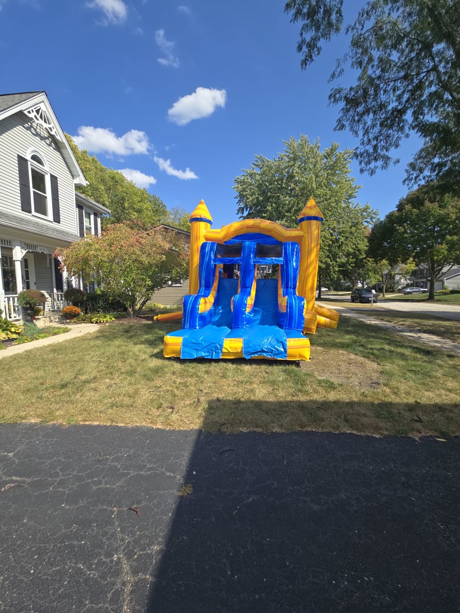 Looking for the ultimate attraction to elevate your next celebration? The JC'S Mini Combo is the perfect addition to transform any party or event into a day filled with laughter and excitement! With its eye-catching blue and yellow marble design, this combo unit is a favorite for birthday parties, school events, church events, and more in your local area.