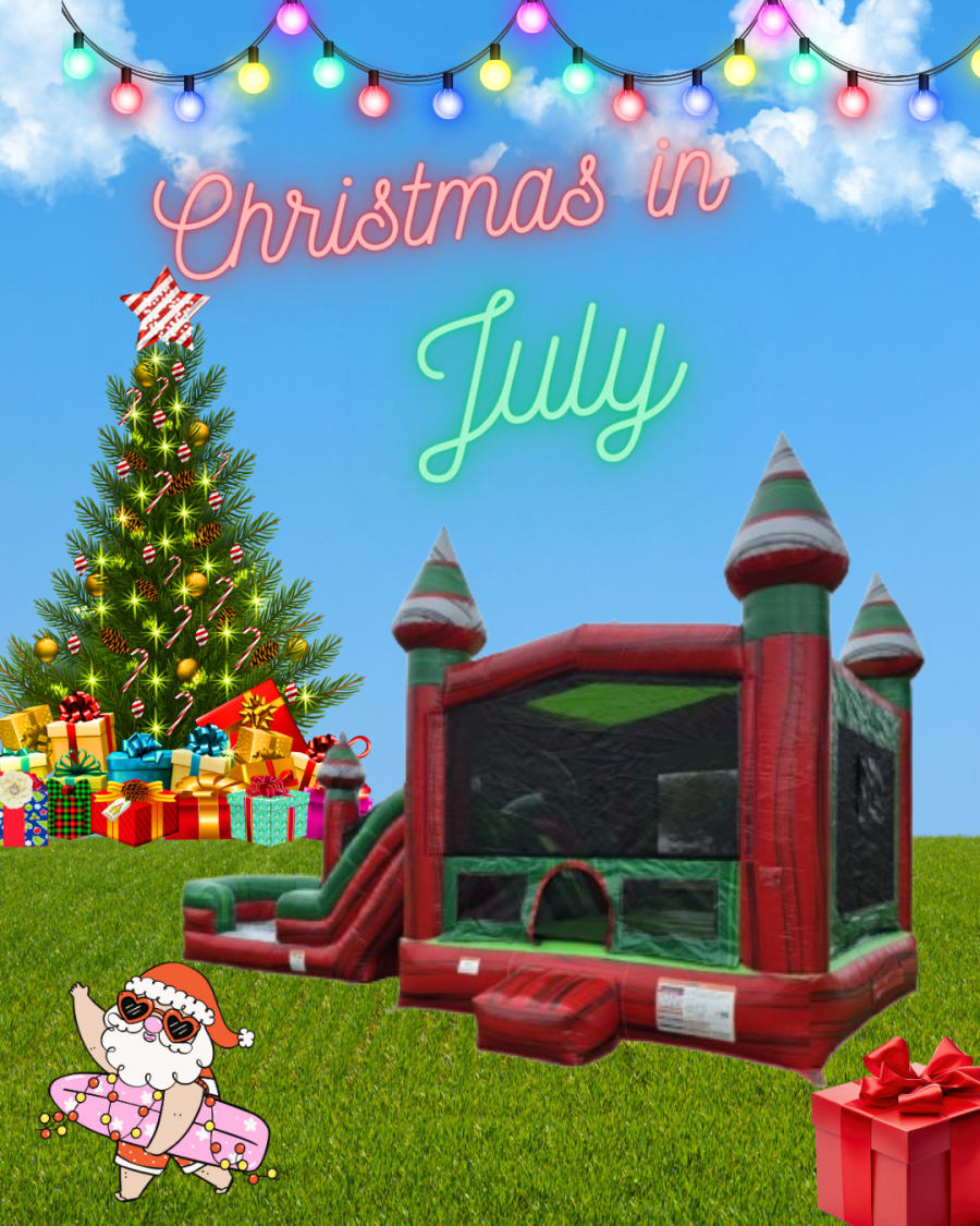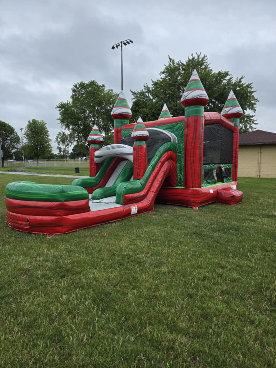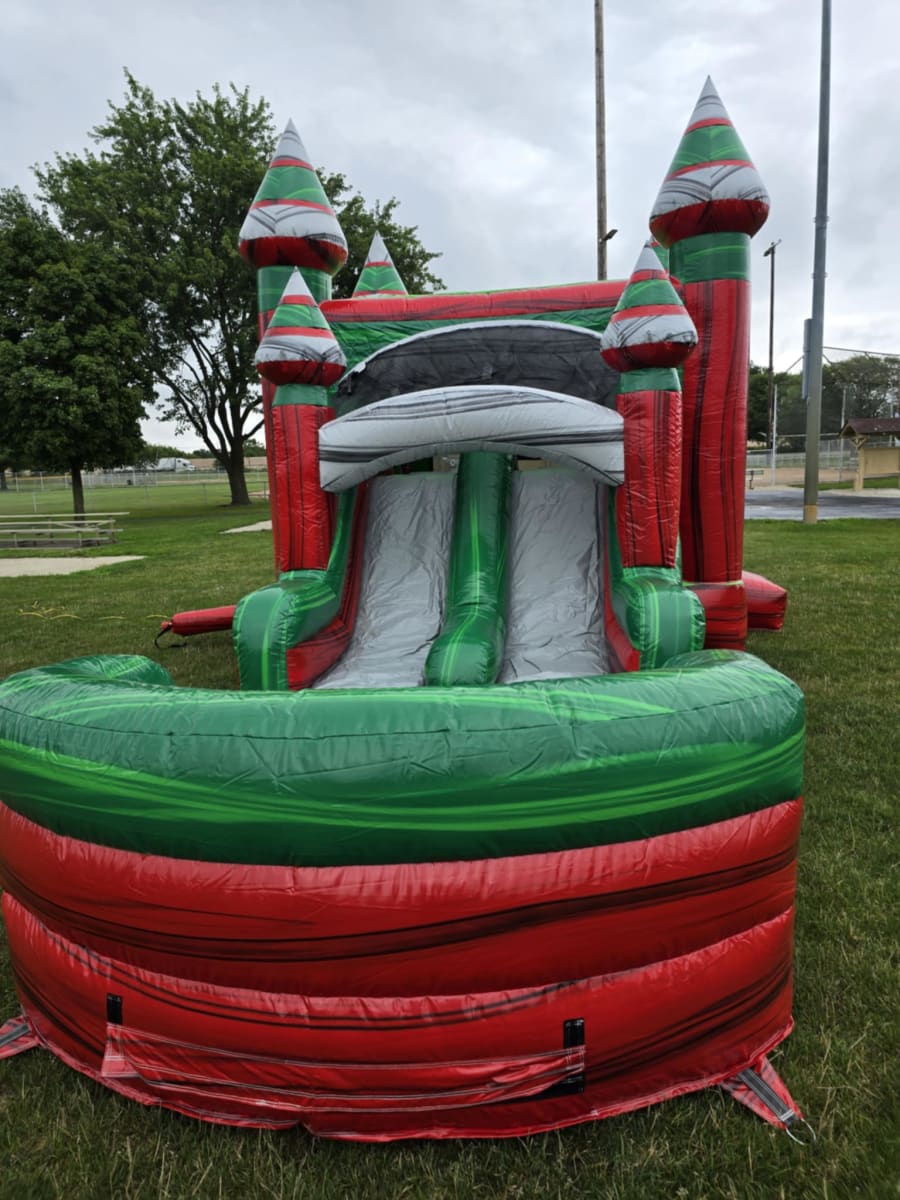 Experience the magic of the holidays no matter the season with our vibrant Christmas in July inflatable! Featuring a stunning red marble vinyl design with unique green and gray marble accents, this bounce house and slide combo delivers festive fun for kids and adults alike. Whether you’re planning a birthday party, family reunion, or community event, this inflatable is sure to be the centerpiece that creates unforgettable memories.
