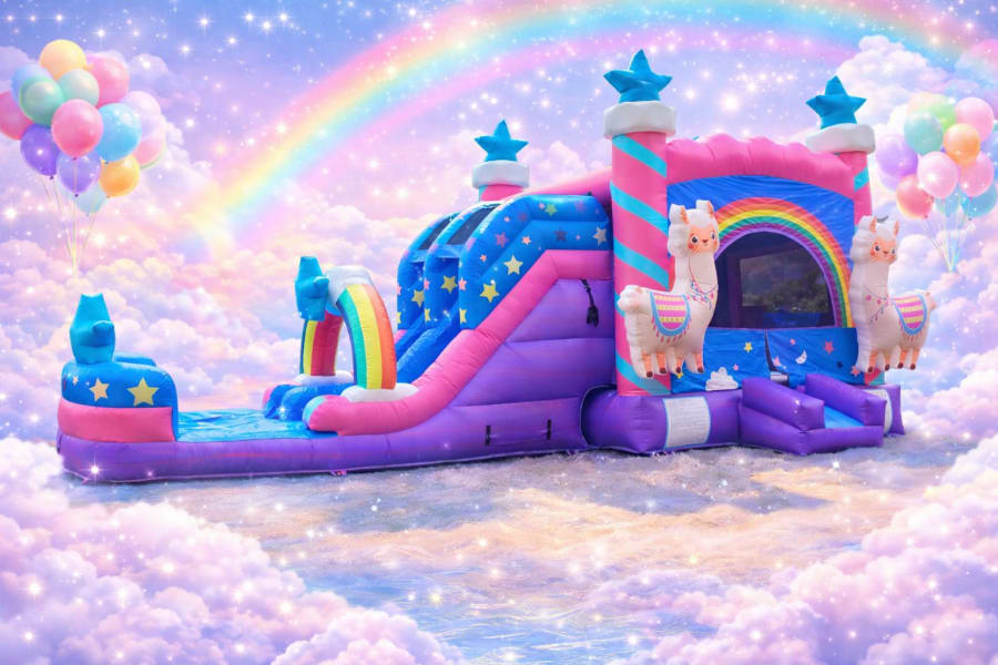 Make your next event a hit with the Llama Llama Bounce House Slide Combo! 🦙🌈 This vibrant and fun inflatable features a pink, purple marble, and blue design with stars, a rainbow arch with cloud and stars, and 3D llamas for added whimsy. Kids will love the dual lane slides and the inflatable pool with 3D stars at the end, perfect for both wet and dry use.