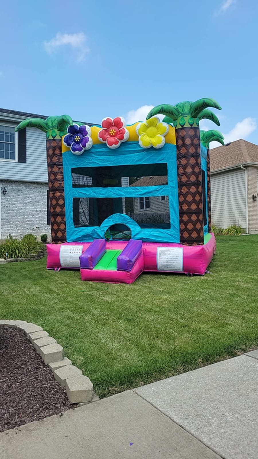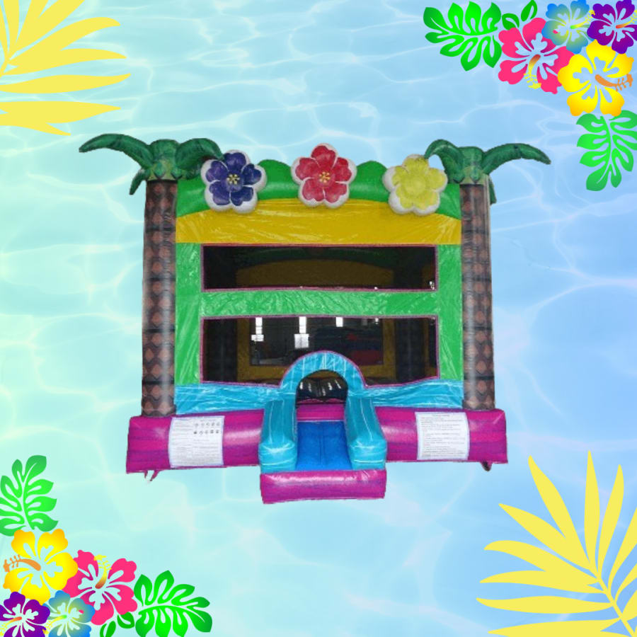 Welcome to the ultimate tropical paradise right in your backyard! 🌺 The Luau Bounce House is perfect for adding a touch of Hawaiian flair to your next event. Featuring a vibrant combination of pink marble, teal marble, green and yellow accents, as well as 3D purple, pink, and yellow Hibiscus flowers, this bounce house is sure to impress your guests.