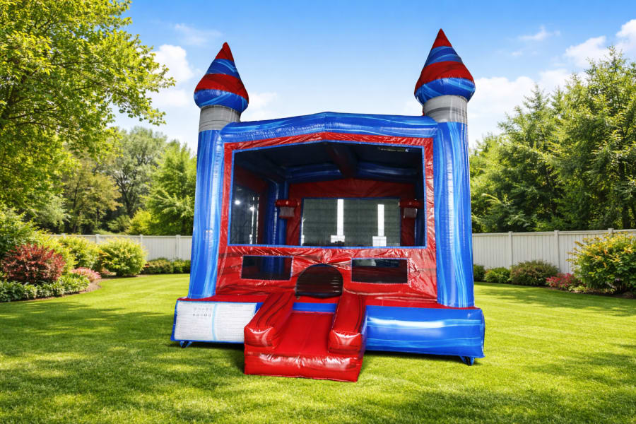 Get ready to elevate your party to new heights with our exciting Baja Blast Bounce House! 🎉 This vibrant inflatable features a striking combination of blue and red marble design, accented with sleek gray marble elements. The spacious jump area provides ample room for kids to bounce and play to their heart's content, while the two basketball hoops add an extra element of fun and competition. 🏀🎈