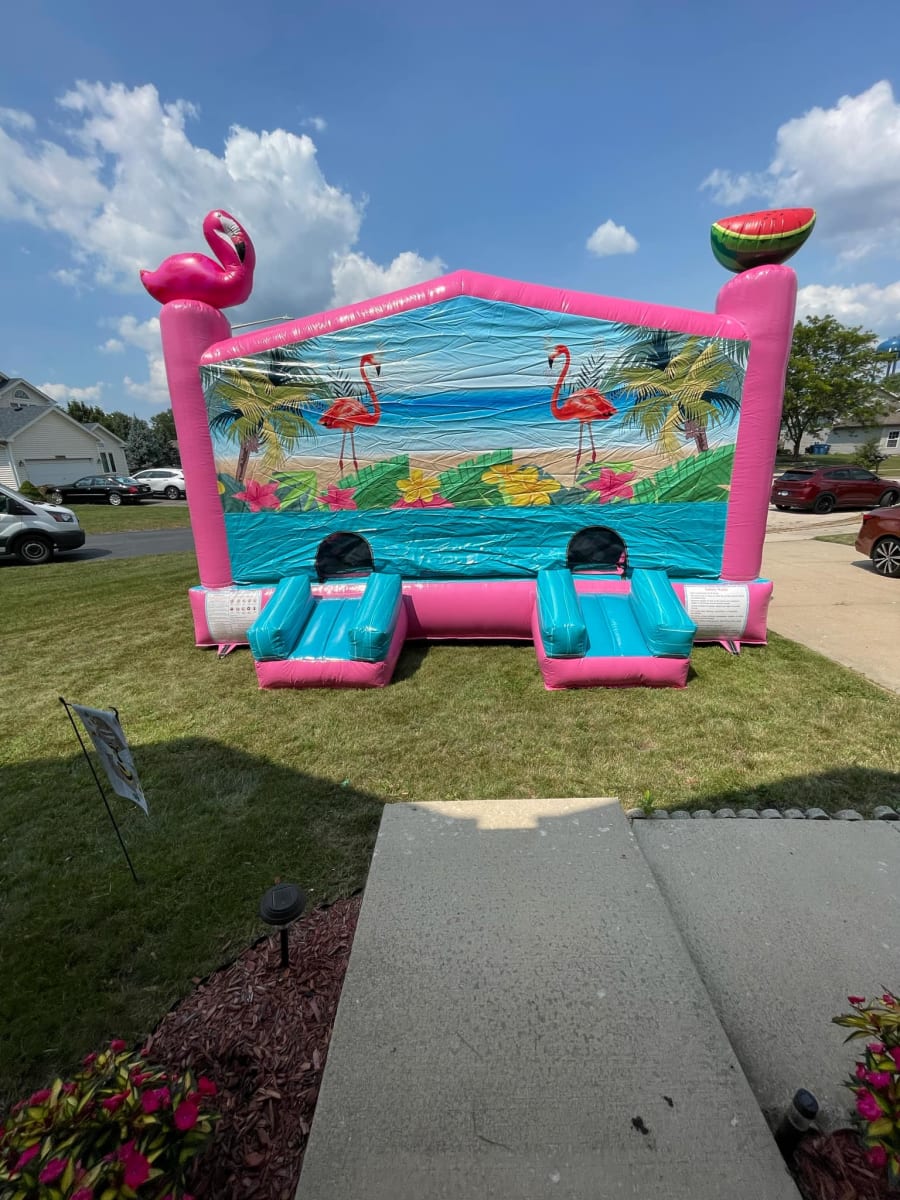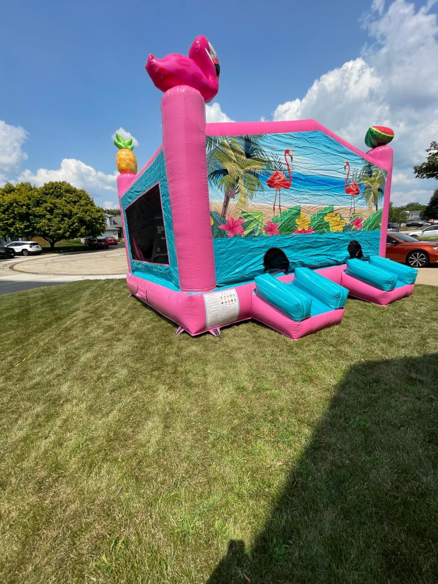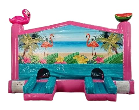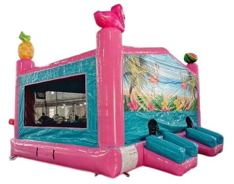 Turn your party into a tropical paradise with our XL Island Paradise Bounce House! 🌴🍉 Featuring a vibrant pink and teal marble vinyl design adorned with 3D pineapples, flamingos, and watermelons, this bounce house is a visual delight for all ages. The art panel showcases a serene beach scene with flamingos, palm trees, and hibiscus flowers, transporting your guests to a sunny island getaway. 🏝️🌺
