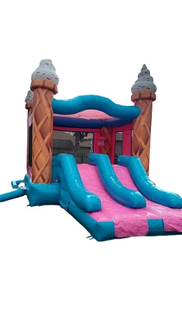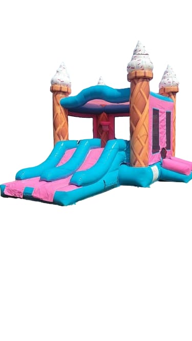 Make your party a sweet success with our Ice Cream Mini Combo! 🍦 This colorful inflatable features dual slides in pink and light blue, complete with adorable Ice Cream cone pillars topped with delicious-looking ice cream treats. The spacious jump area is perfect for bouncing fun, and the two basketball hoops add an extra element of excitement for your guests.