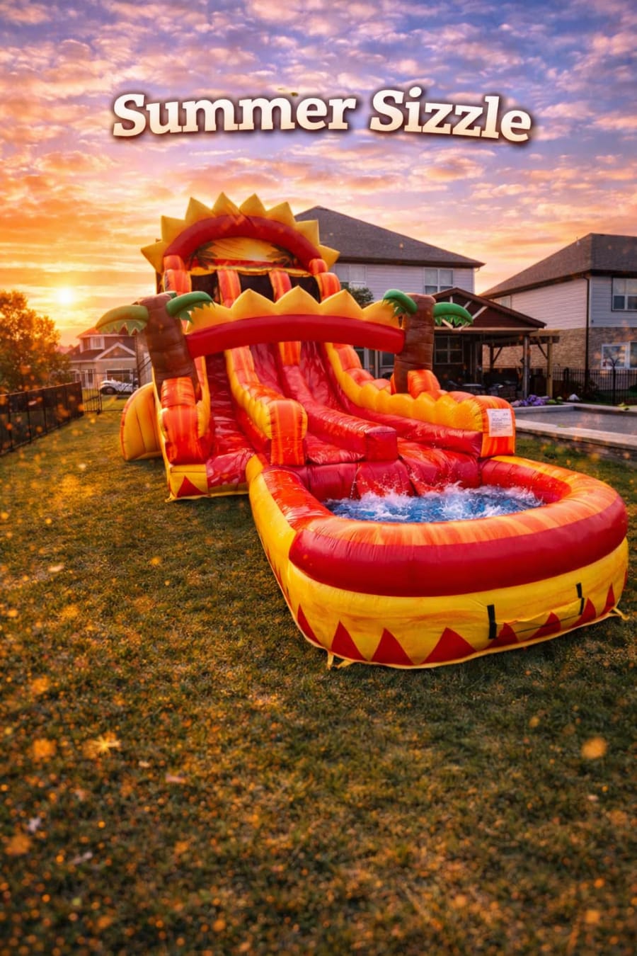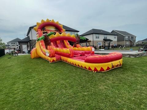 Get ready to elevate your next event with the vibrant and thrilling 18 Ft Summer Sizzle Hybrid Slide! 🌴🌅 This dual-lane inflatable slide features a captivating design with yellow marble, red, and orange marble elements that will add a burst of color and excitement to any party.