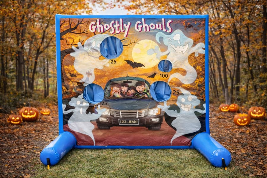 Transform your next event into a haunted extravaganza with the Ghostly Ghouls Toss game. This thrilling blue frame game features a free-standing structure depicting a spooky scene of a car filled with kids and adults, while 4 mischievous ghosts fly overhead under a glowing moon. Watch out for the bats fluttering by!
