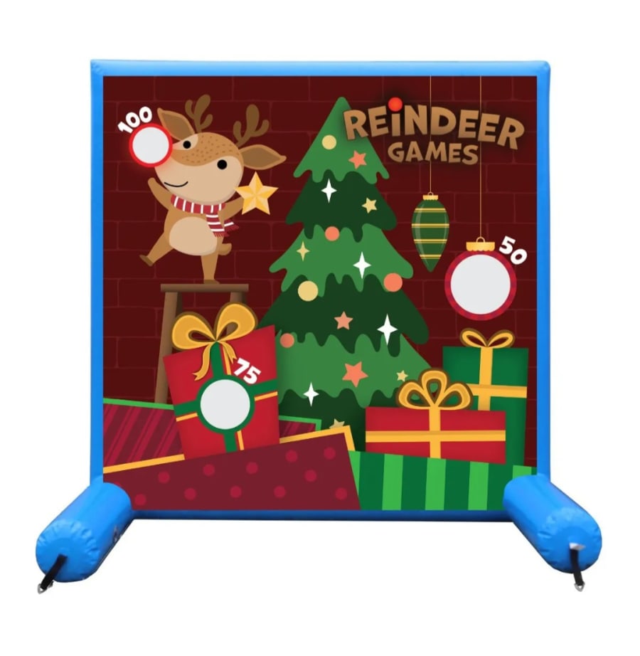 Bring holiday fun home with Reindeer Games. A colorful Christmas tree, playful reindeer, and wrapped presents with gold bows create a cheerful target course. Six soft balls — styled as Christmas ornaments — make every toss safe and festive. Score points, beat the clock, and create family memories. Reindeer Games in Yorkville, Oswego, Shorewood, Bolinbrook, Burr ridge, Lemont and surrounding areas. 🎄✨