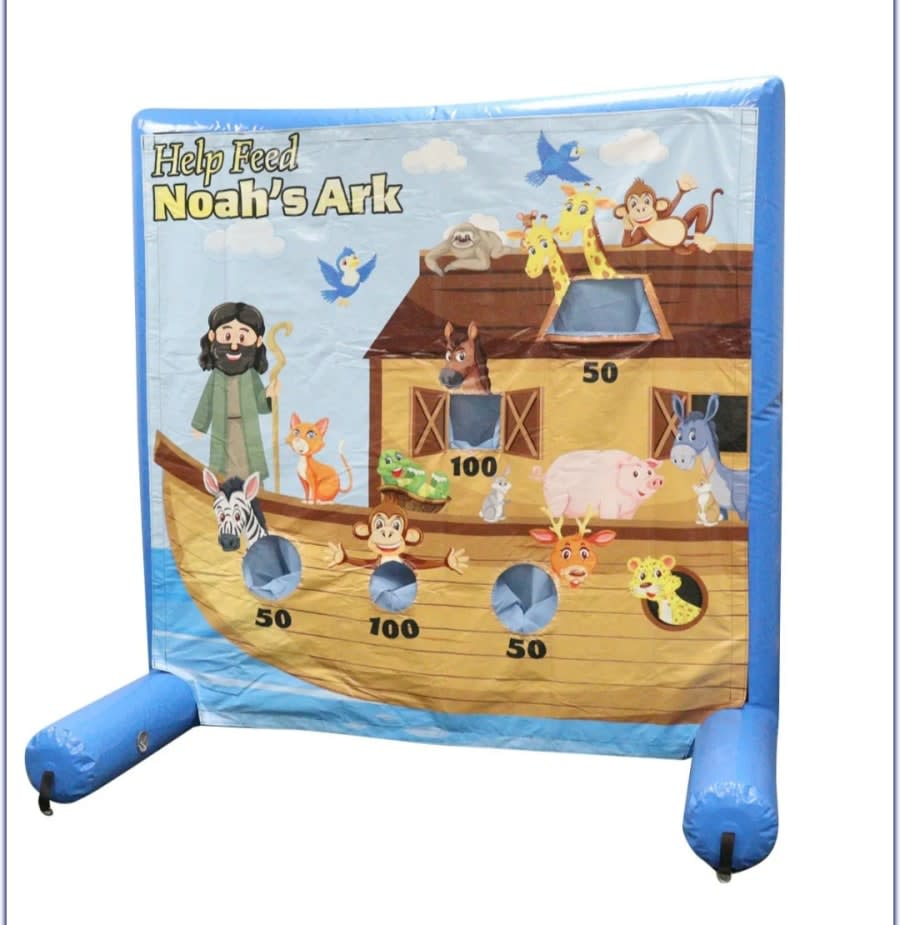 Bring classic carnival fun to your next party with the Noah's Ark Toss. This free standing, colorful ark-themed game features a friendly Noah, a parade of animals, and numbered scoring holes that keep kids engaged. Includes 6 soft toss balls for safe play. Perfect for birthday parties, church events, school fairs, and backyard gatherings. Noah's Ark Toss in Channahon, Elwood, Mokena, Burr Ridge, Woodridge, Naperville, Yorkville and surrounding areas.