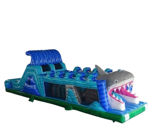 Get ready for an epic adventure with our 50ft Jaws Obstacle Course! 🦈 This thrilling inflatable obstacle course features a vibrant teal, green, and blue marble design that will capture the attention of all party-goers. Perfect for dual players, this course is packed with exciting elements such as pop-ups, tunnels, squeeze logs, and more!