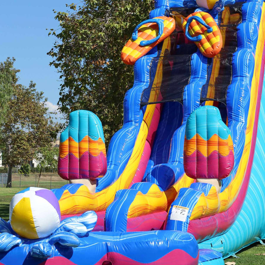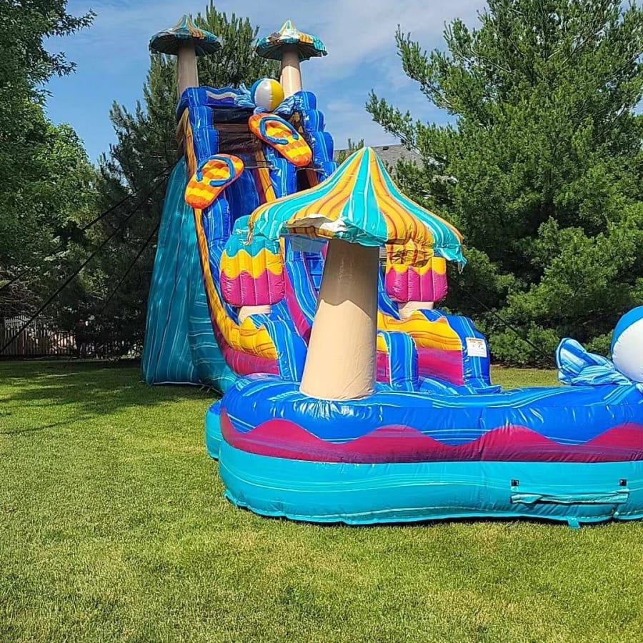 Get ready to elevate your next party with our vibrant and exciting 25ft Beach Party Water Slide! 🏖️ Perfect for turning your backyard into a tropical paradise, this single-lane water slide features a stunning teal, pink, blue, and yellow marble design that will instantly transport you to the beach.